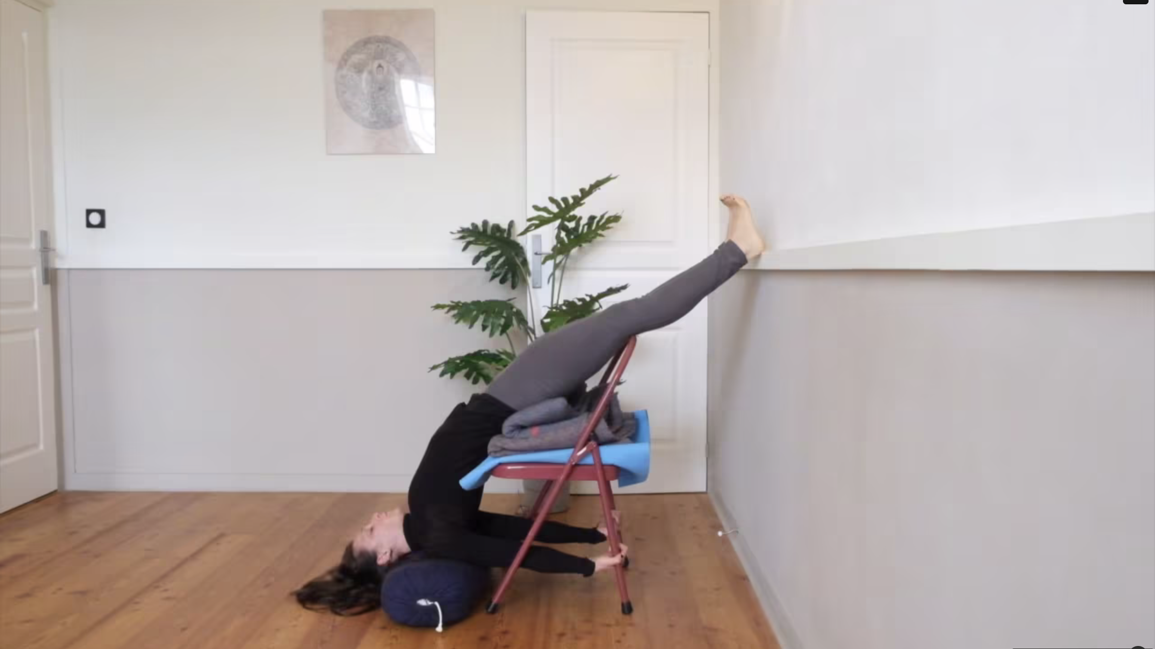 Matériel utile : 1 mur, 1 sangle, 1 chaise éventuellement mais moins important 1 bolster, 2 briques, 1 couverture pour supra baddha konasana à la fin.